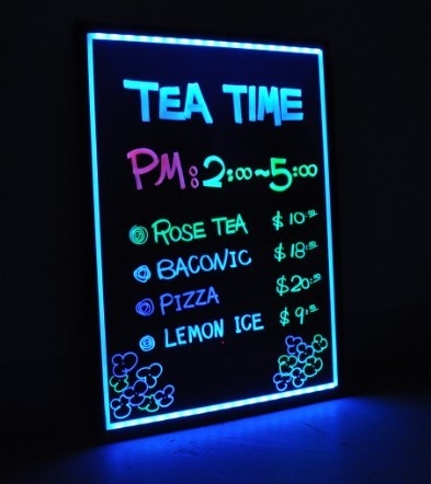 Конструкция этого светового табло представляет собой стеклянную или акриловую панель в форме прямоугольника. По ее периметру закреплена рамка из алюминия, на которой расположены светодиоды. К флэш-доске прилагается комплект флуоресцентных маркеров, с помощью которых можно создавать любые картинки и записывать текстовые посылы целевой аудитории. Так как надписи и рисунки красиво светятся на поверхности доски, пройти мимо этой рекламной вывески довольно сложно. Есть варианты панелей, которые не просто светят, а мигают, мерцают, переливаются. Это зрелище просто завораживает взгляд. Люди смотрят, останавливаются, читают, запоминают – именно это и нужно создателям рекламной надписи.