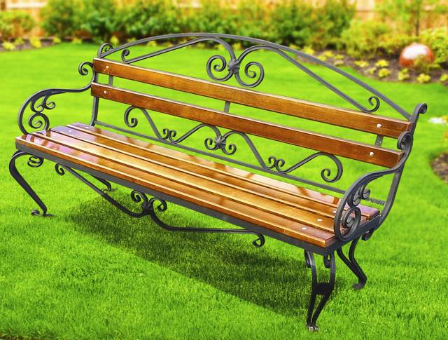 Каркас скамейки изготовлен из металлического профиля с последующим покрытием эмалью черного цвета. Настил и спинка для сидения изготовлен из бруса хвойных пород с последующим нанесением морилки (светлой или темной) и покрывается яхтным лаком.