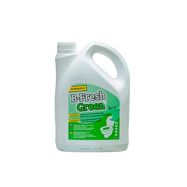 Туалетная жидкость B-Fresh Green — экономичный расходник для биотуалета. Заливается в нижний бак в пропорции 75 мл на 10 л воды, после чего следует добавить 2-3 литра воды из-под крана. Эффективно расщепляет отходы, включая твердые тела. Благодаря B-Fresh в туалете не скапливаются газы и неприятные запахи. Жидкость соответствует стандартам и не содержит формальдегидов, а также других веществ, опасных для человека. Рекомендуется заливать в биотуалет раз в 3 дня.